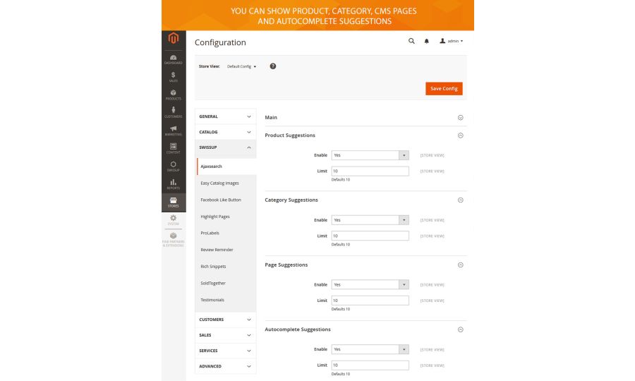 - set a limit of suggestions per products, categories, CMS pages separately