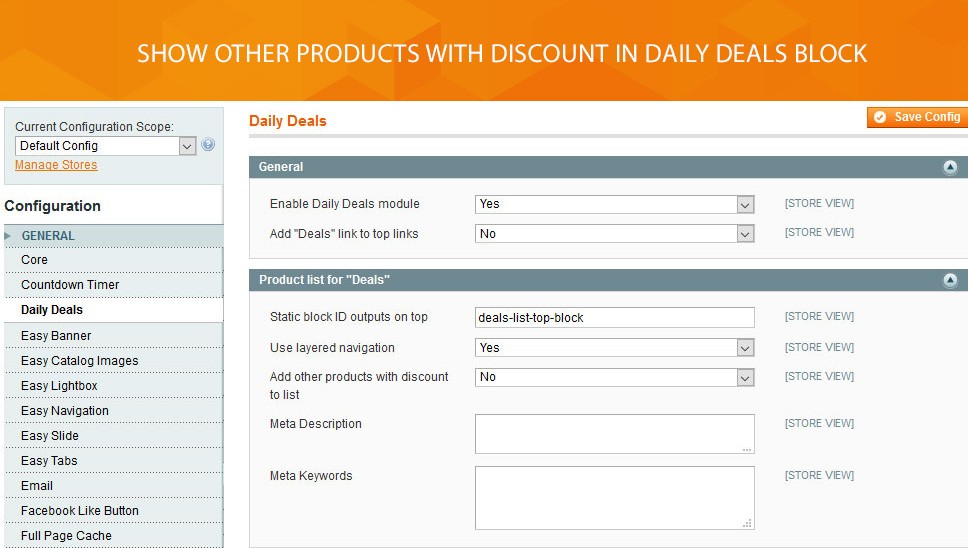 Use Daily Deal to optimize your website for better SEO results. Promote what you need to sell by utilizing landing page with the list of all products in active deals at this moment. Our module comes with landing page where users can see all products with discount. Moreover, you can add other store items to be shown on Deals landing page. In order to make the store appear in multiple search results feel free to add relevant meta keywords and meta description.
