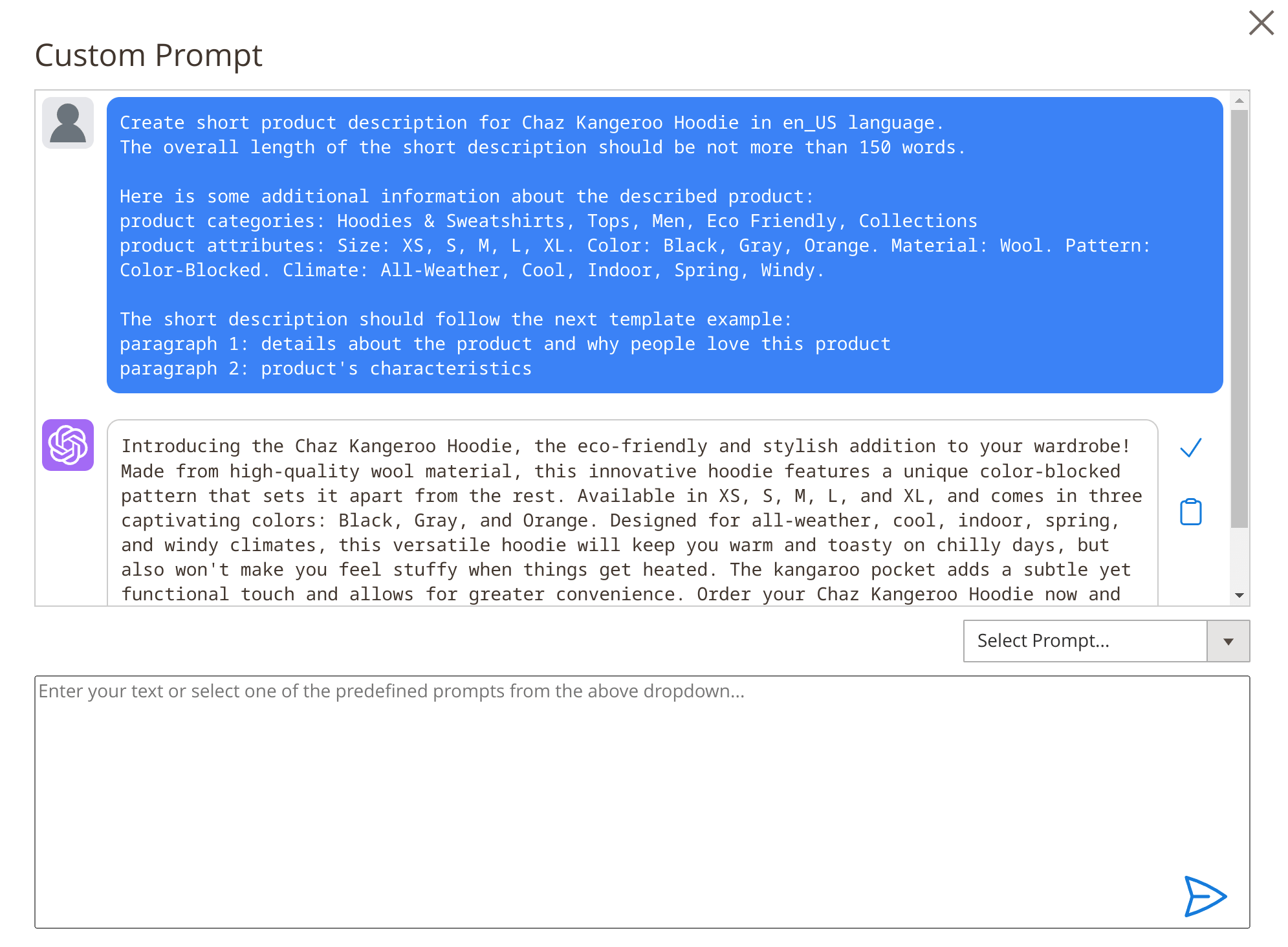 That's good news for store owners who strive to improve customer experience and increase the efficiency of the workflow. The Magento 2 ChatGPT integration helps you to automate various tasks such as creating the product description or generating meta tags for your store pages.
