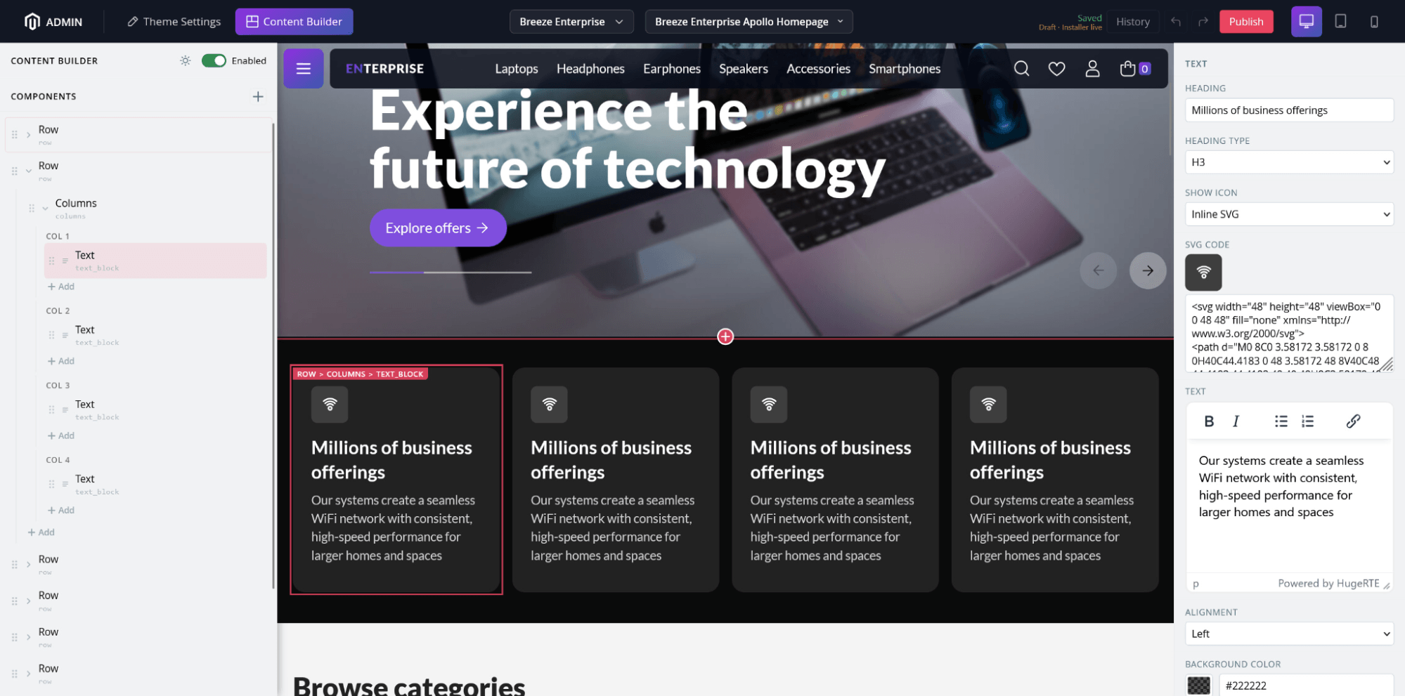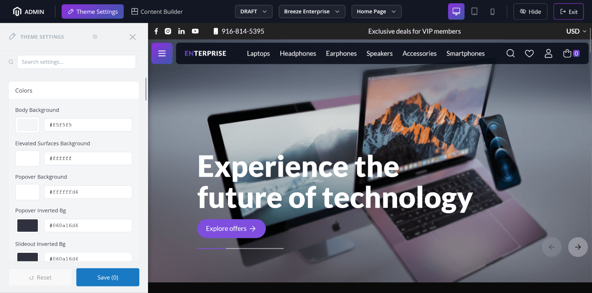 Breeze Enterprise brings the Breeze frontend to its full potential. It combines three powerful tools in one package: a theme editor, a content builder, and a pre-built theme. They all work together to reduce the time it takes to build a Magento 2 store.
