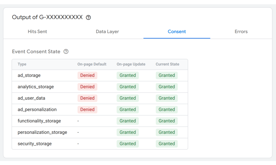- Do not set Google consent values until customer presses “Accept” or “Deny” buttons.