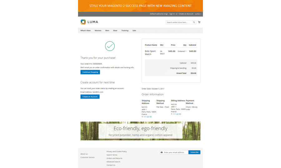 Magento order confirmation page is a good place to tell customers more about your store offerings. The well-arranged custom checkout success page will make it much more appealing to get feedback. A Magento 2 Checkout Success extension was designed to help you create the most amazing Thank you page.