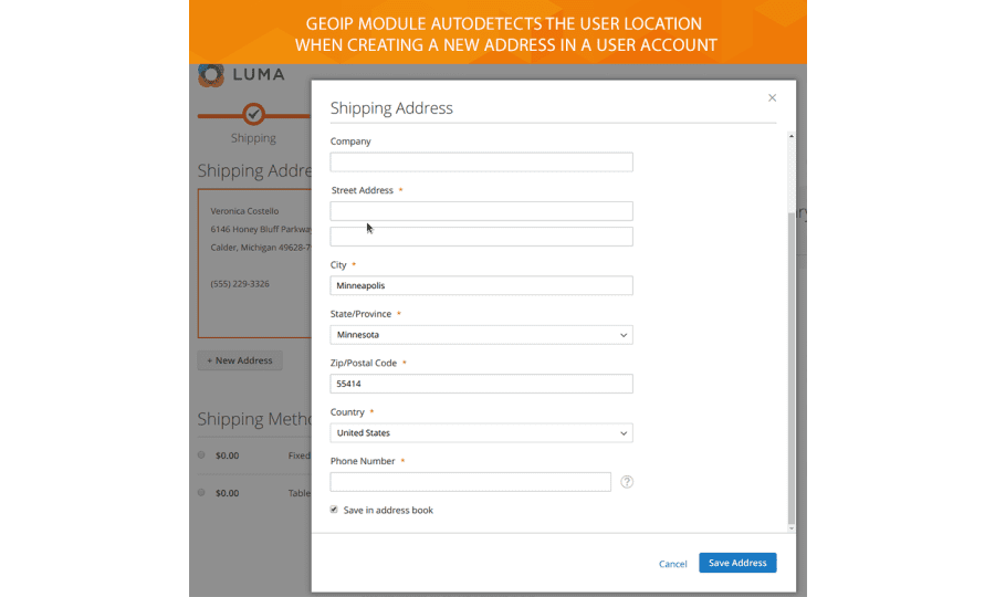 Magento 2 Geo Address IP extension is based on MaxMind library geolocation. You can use our module as a way to determine country, region and city of your customers on the checkout page as well as when creating a new address in a user account. It fairly simplifies the process of filling address fields and enhance the user experience at all.
