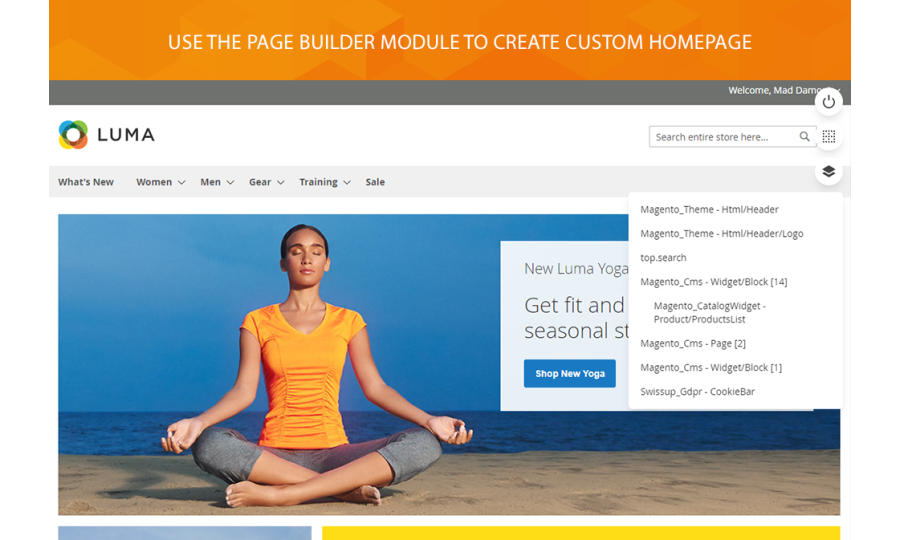 With the Page Builder, it's easy to customize the Magento 2 store homepage - to make sure it fits the style of your business. Through the module interface, you can change the welcome text and the cms block in the header. You can upload the new logo. You can change the images in the blocks. It's easy to configure the Magento block with social links as well as footer links block.