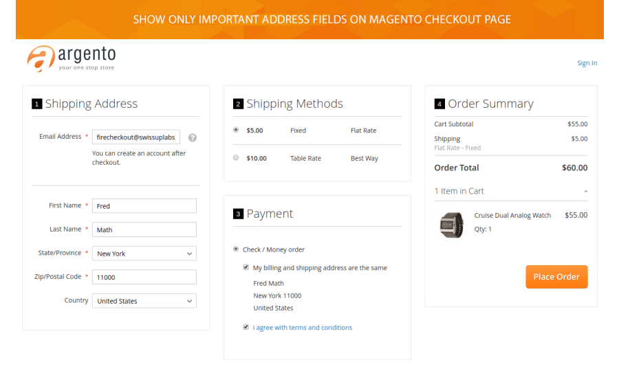 Now you can easily customize the address fields as well as to create the custom ones. Custom address fields will be automatically displayed on checkout billing and shipping address forms, and in a customer account. The module supports the following field input types: Text Field, Text Area, Date, Yes/No, Multiple Select, Dropdown.