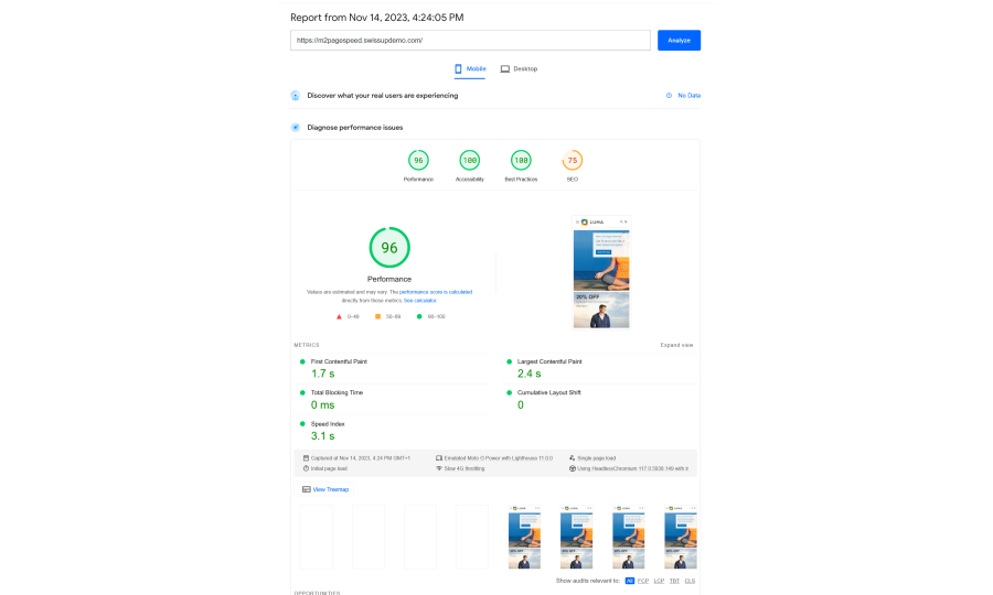 You can start testing pagespeed issues in Magento 2 speed up developer mode. Our module also includes the Analyze config to help you test page speed score directly from the backend
