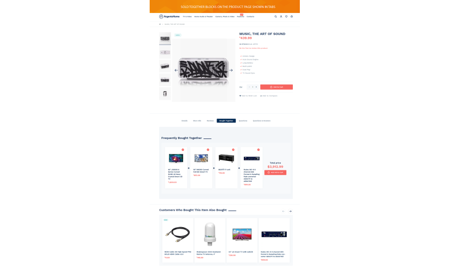 The Sold Together extension for Magento 2 helps you to add cross-sell blocks to the product page. The blocks show the products from the existing orders in your store. Thus your customers see items that they may not have seen before when browsing the product catalogs. The attractive Sold Together blocks engage users to put more items in the shopping cart.